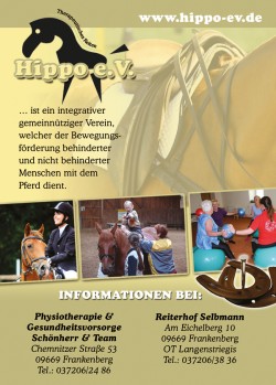 Therapeutisches Reiten „Hippo“ e.V. ist ein integrativer, gemeinnütziger Verein, welcher der Bewegungsförderung behinderter und nicht behinderter Menschen unter anderem mit dem Pferd dient. Bei dem Verein kann jeder vorbeischauen, zusehen, sich informieren und mitmachen. Selbstzahler Leistungen Krankengymnastik auf dem Pferd (orthop./ neurolog.) Ergotherapie auf dem Pferd Gesundheitssport Wir beraten Sie gern! In Kooperation mit dem Hippo e.V. als Mitglied (www.hippo-ev.de)